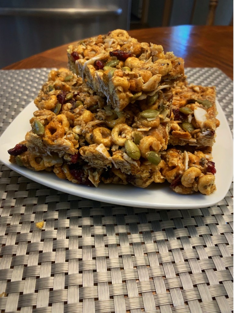 - Place Cheerios, oats, coconut flakes, dried cranberries, pepitas, sunflower seeds, hemp and chia seeds in a large bowl. Toss to combine.